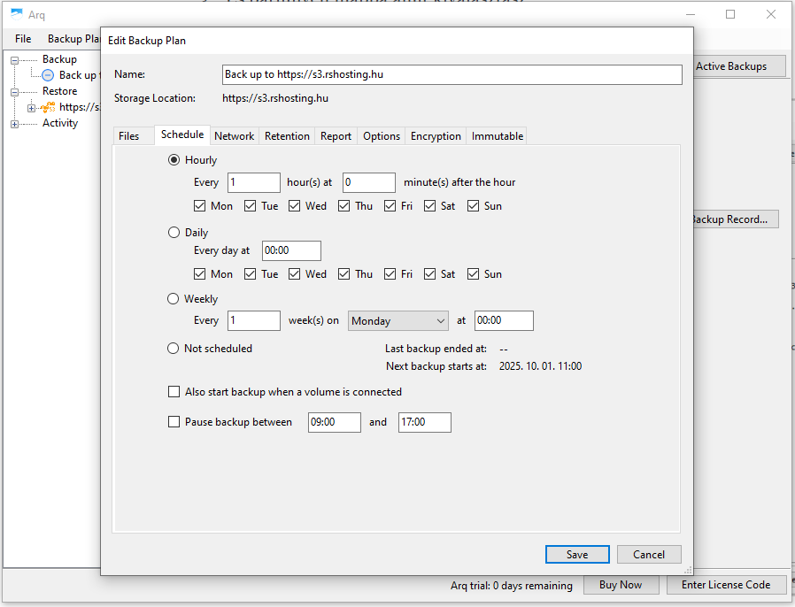 És utána amit itt megadunk. Ez most óránkénti mentésre lett beállítva. De lehet Napi(Daily), esetleg Heti (Weekly), vagy hogy ne mentsen autómatikusan.