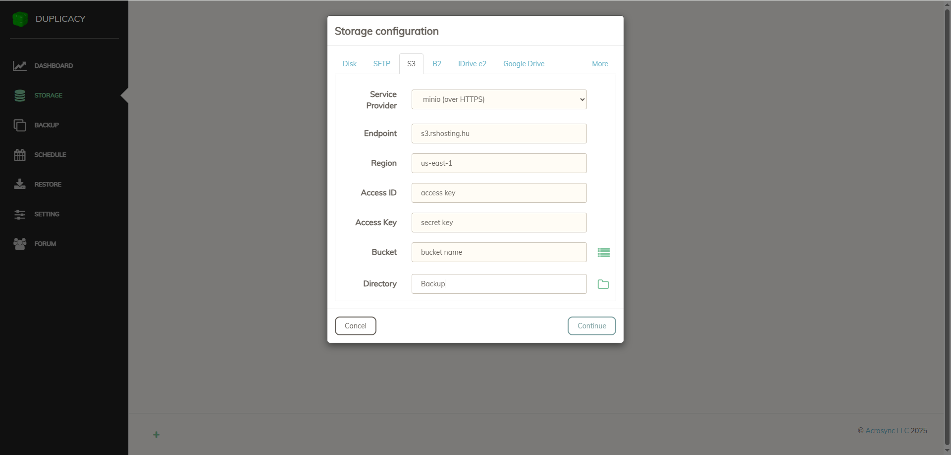 Válaszd a cél típust: S3-Compatible Server-t, majd Continue.