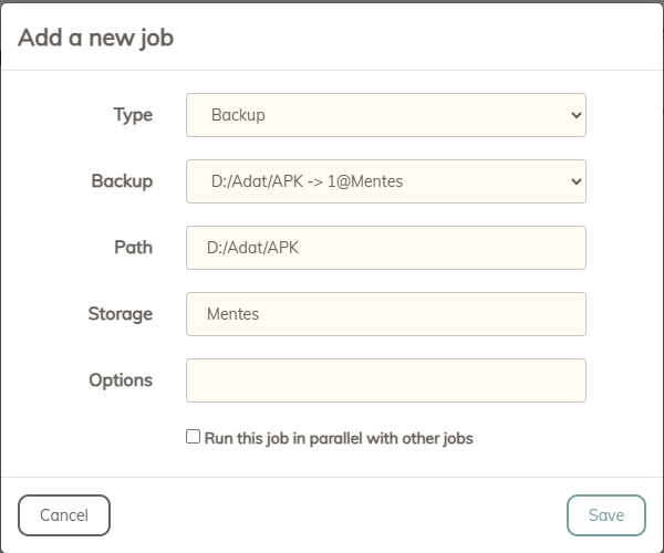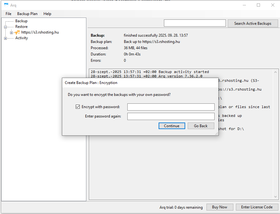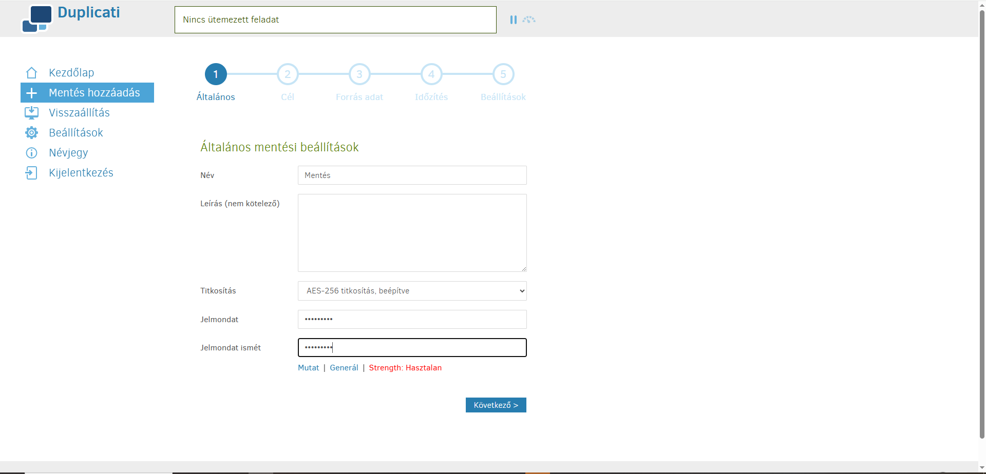 - Password: Jelszó bármi csak ne felejtsük el, mert ez az adatot mint szolgáltató még én sem ismerem, enélkül a mentés visszaállíthatatlan.