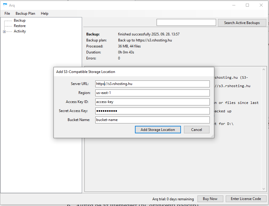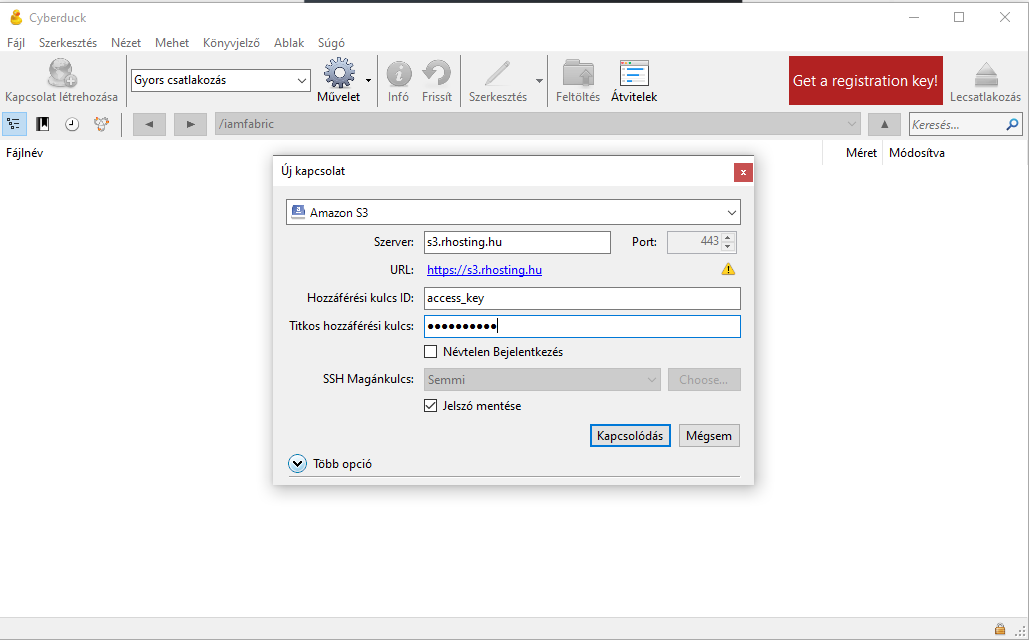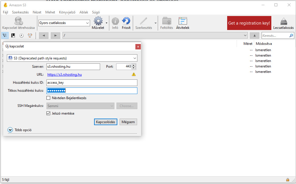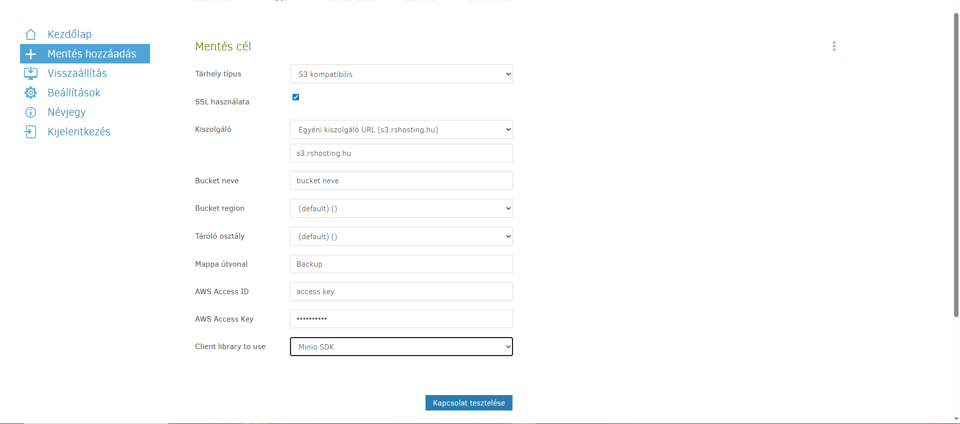 https://s3.rshosting.hu. - Add meg a hozzáférési kulcs ID-t és a Secret kulcsot.