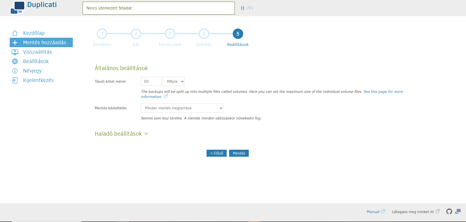Mentés hozzáadás menüpont, Új mentés beállítása és Következő.