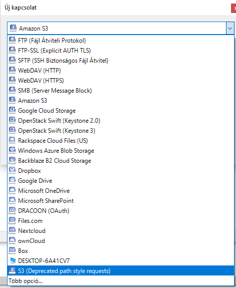 Mivel az az opció ami nekünk kell még nincs feltüntetve választhatóként ezért egyenlőre válasszuk az Amazon S3, de ezzel nem fog működni, csak beállításra fogjuk használni.