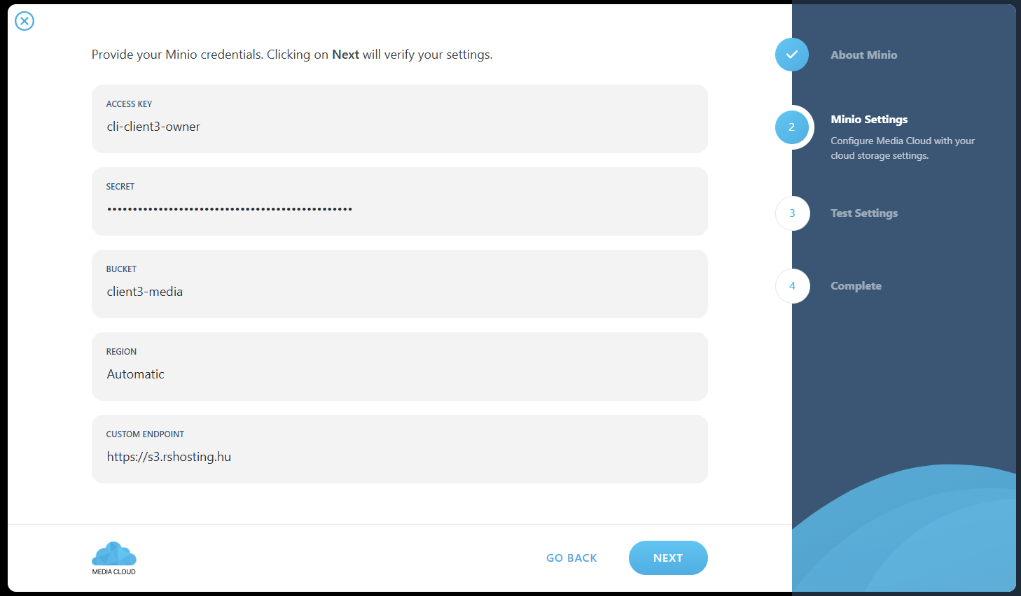 https://s3.rshosting.huvagy a saját aldomain (pl.https://cdn.sajatdomain.hu) - Access Key és Secret Key (ezt mi biztosítjuk)